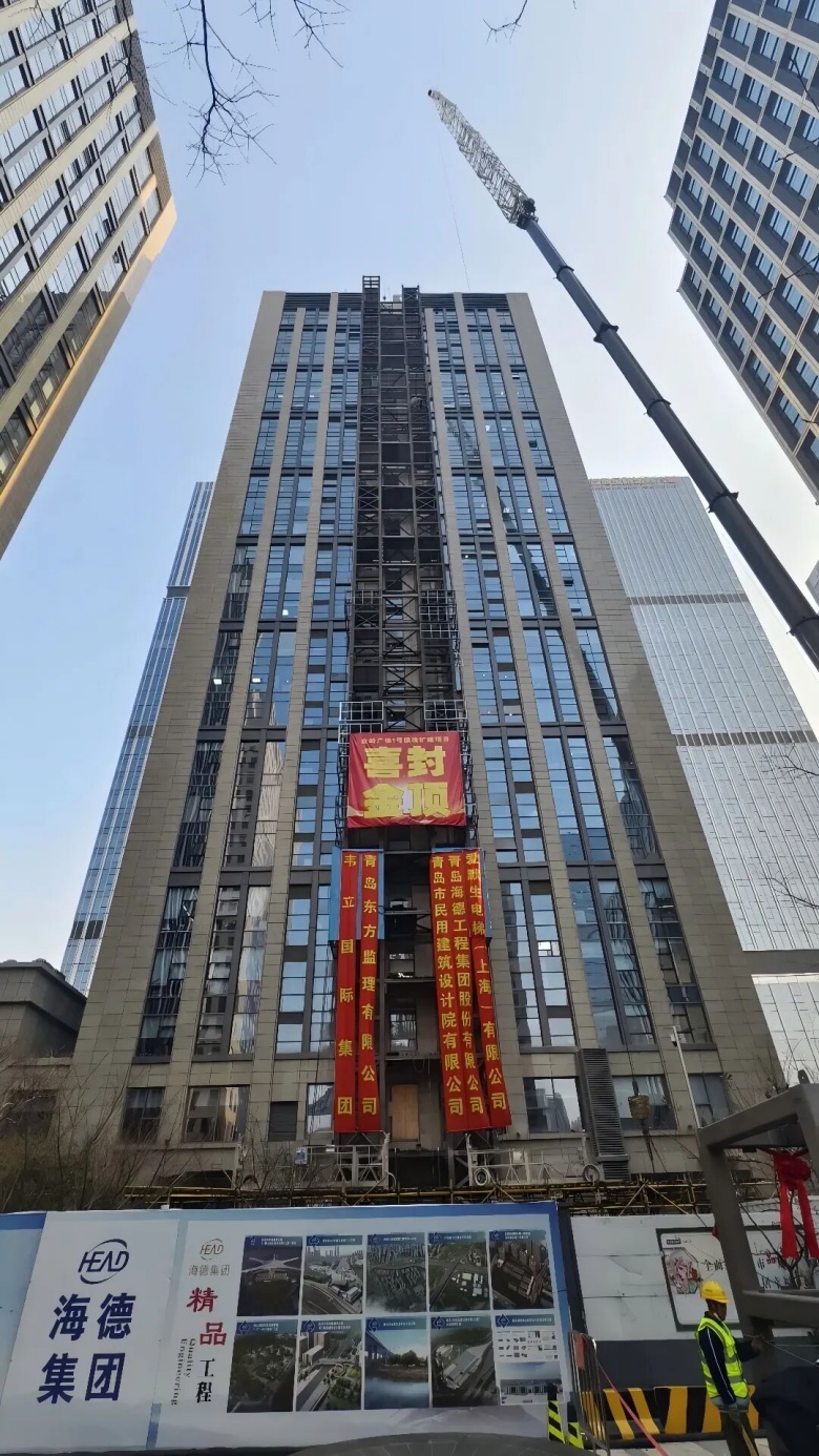 项目位于青岛市崂山区苗岭路28号金岭广场1号楼西侧园区,金岭广场作为崂山区的现代化商务地标建成于2013年,总高27层,随着入驻企业的不断增多以及办公人员规模的日益增长,初始配备的4部电梯已无法满足日常的垂直交通需求,在上下班高峰时段,电梯面临较大的客流压力,导致等待时间较长,严重影响办公效率。本项目将在1号楼西侧增设两部外装电梯,每台电梯停靠28站,钢结构电梯井道高度达103.2米,这一数据刷新了全国既有建筑后装电梯的高度纪录,成为目前已启动同类工程中的“高度之最”。项目建成后将极大缓解1号楼高峰时段的客流压力,减少办公人员的等待时间,提升整体办公效率,为入驻企业和办公人员创造更加便捷、高效的办公环境。