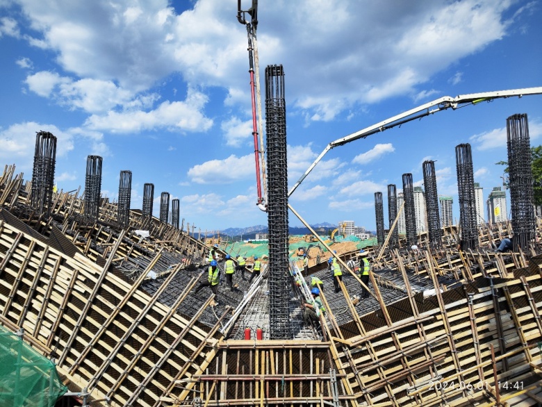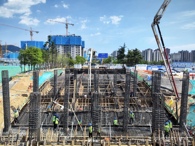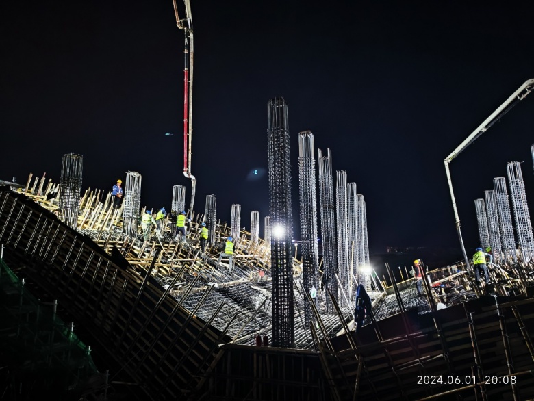 为使拱桥施工过程中受力更加合理,沿拱圈纵向分5段对称进行浇筑,并对每段采取上下分层施工。本次浇筑位置为1#拱座及两侧区域拱圈底板、腹板,采用C50混凝土,方量850m³,现场使用两台汽车泵同时浇筑,浇筑时间持续约20小时。